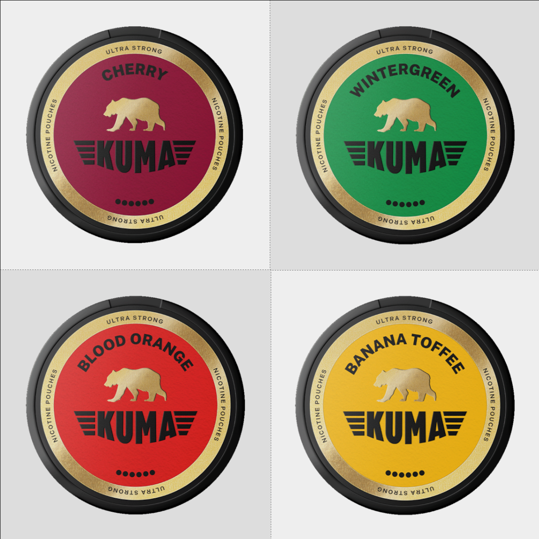 This mix pack contains: 1x KUMA Cherry - Ultra Strong 1x KUMA Wintergreen - Ultra Strong 1x KUMA Blood Orange - Ultra Strong 1x KUMA Banana Toffee - Ultra Strong